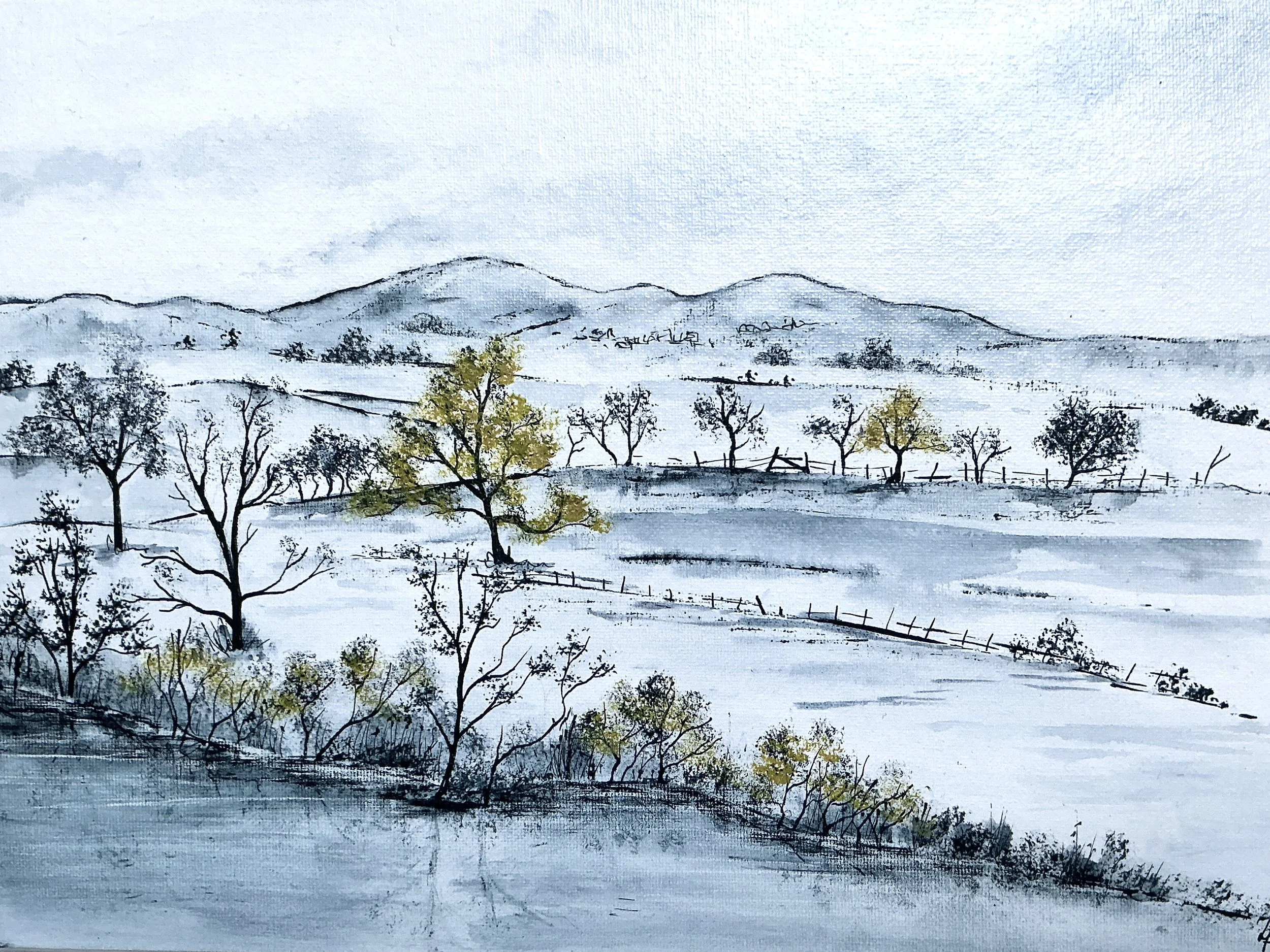 Acrylic ink with acrylic paint highlights on canvas board. Presented in a white wood frame.