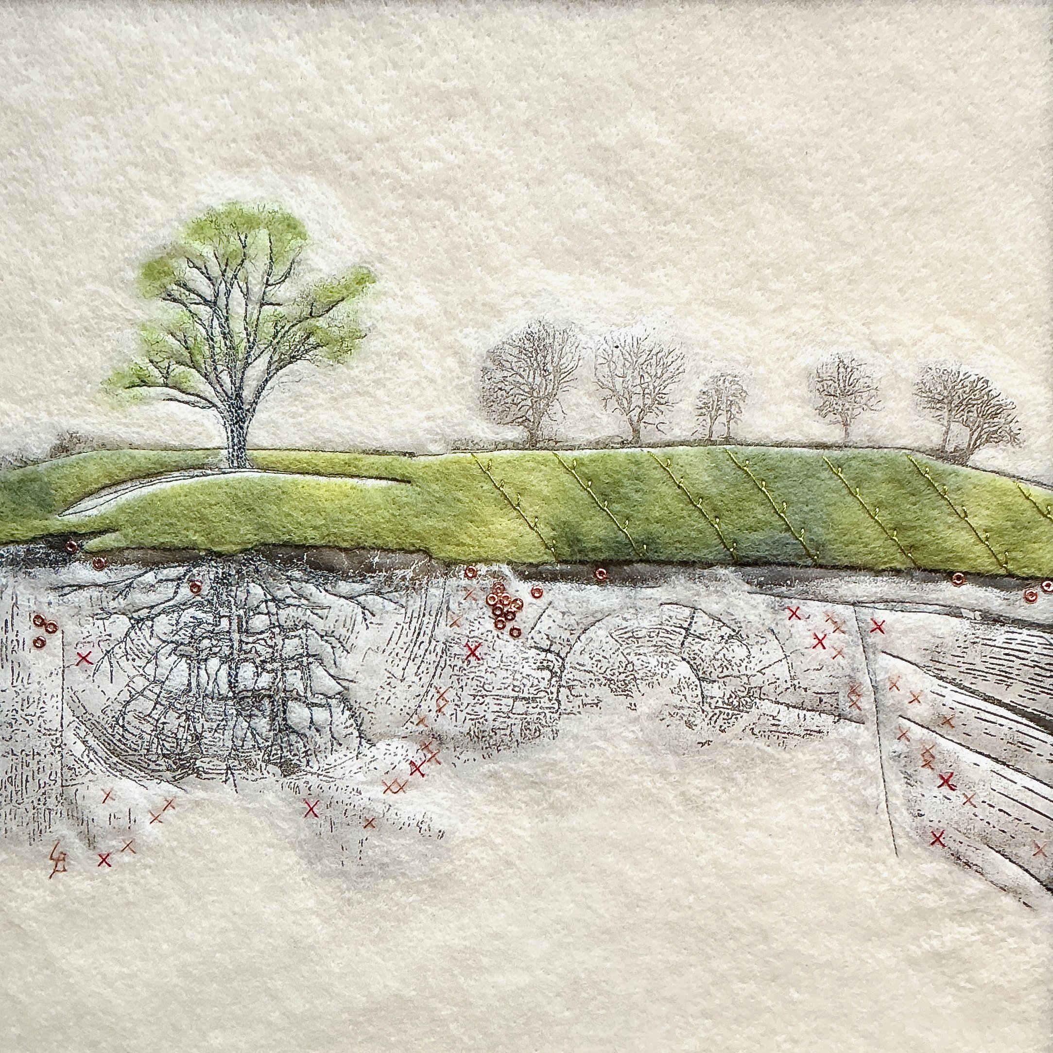 Mixed media textile on natural felt. Presented in a white wood, UV glazed frame.